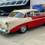 The exterior of this 1956 Chevrolet Bel Air showcases a stunning two-tone color combination of red and ivory. The vibrant red paint exudes a vibrant energy, while the ivory accents add a touch of sophistication and contrast. This timeless color scheme perfectly complements the car’s sleek lines and chrome accents, making it an attention-grabbing sight wherever it goes.